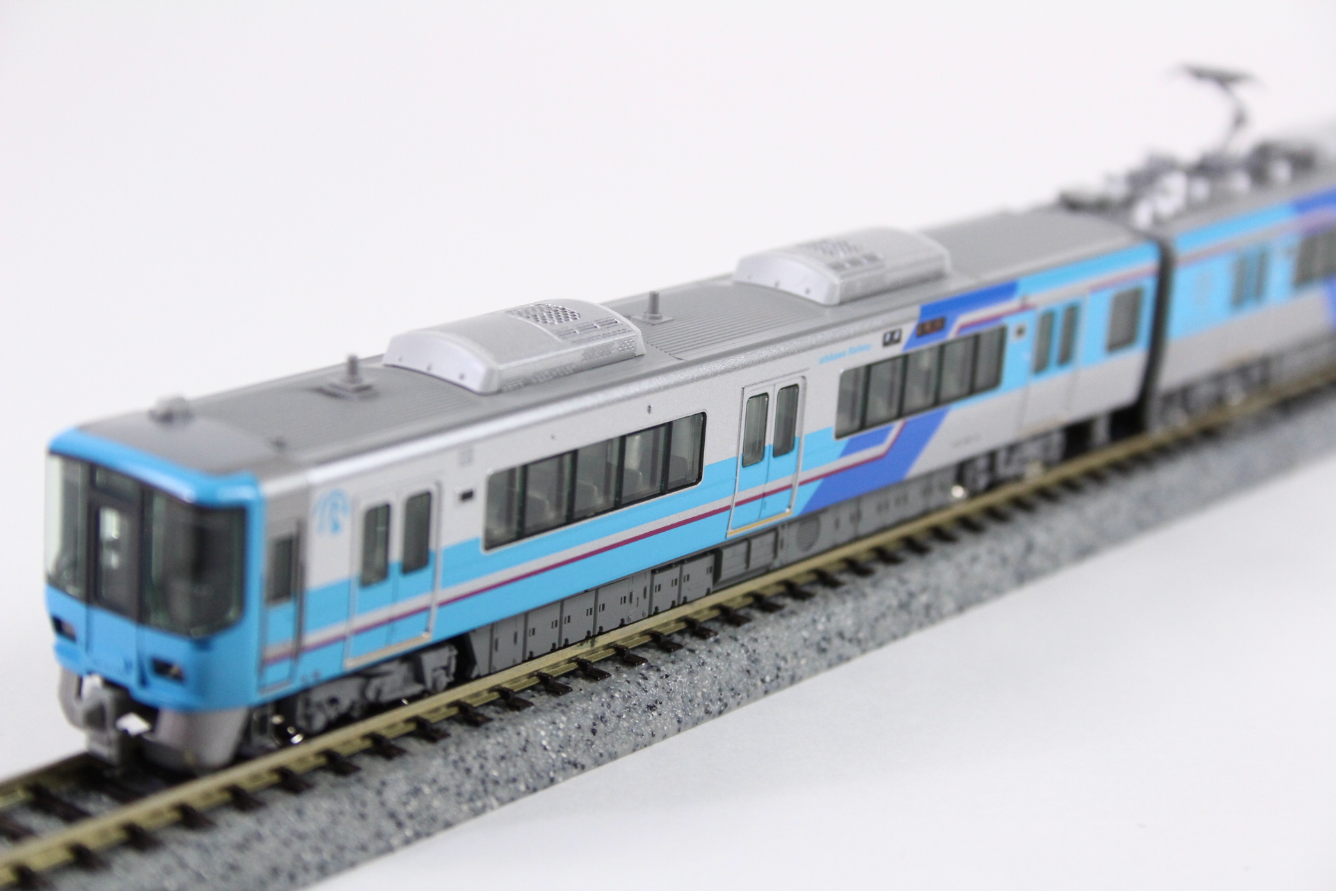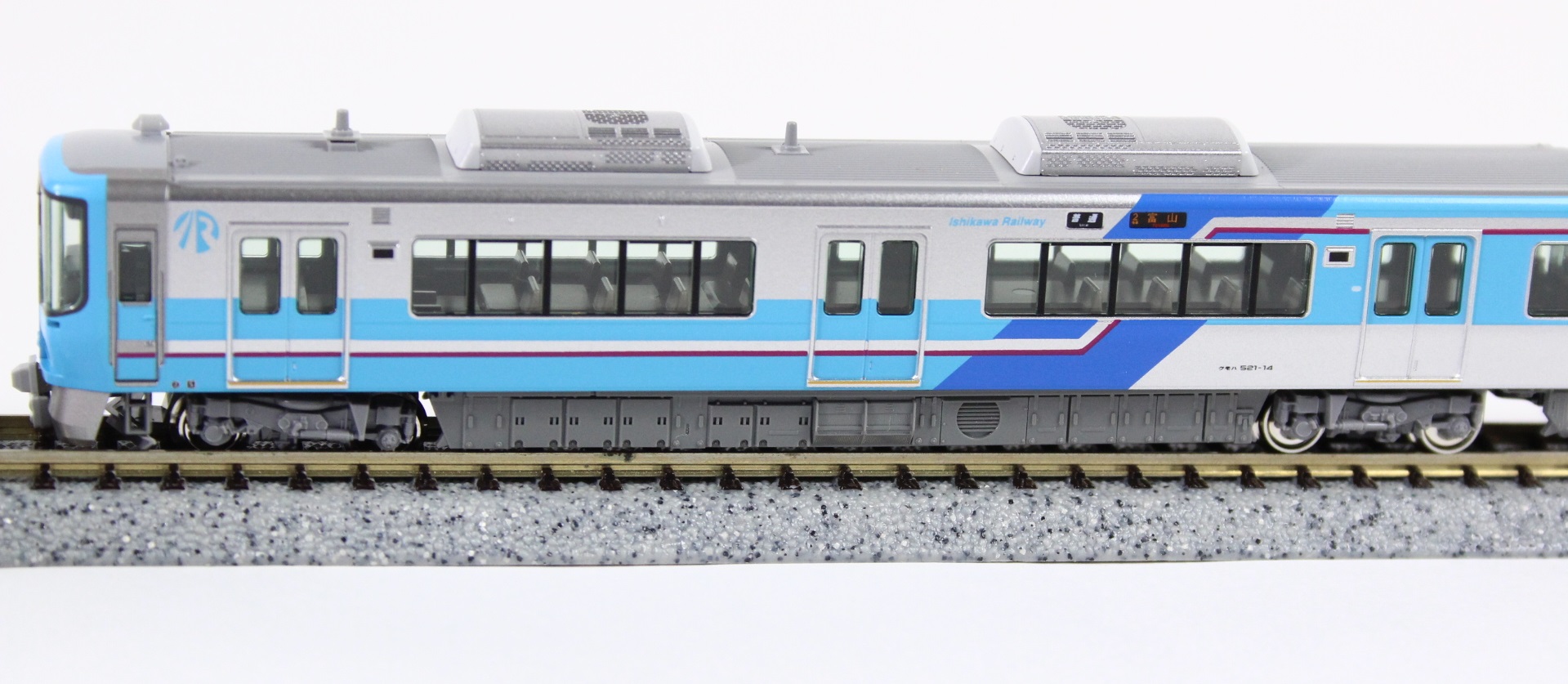 ?IRいしかわ鉄道独自の、前頭部と側面の水色をベースに青色が配された大胆な塗色を的確に再現。