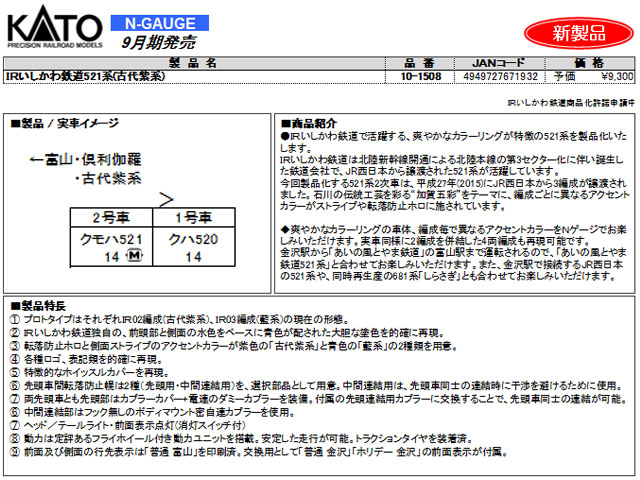 ●IRいしかわ鉄道で活躍する、爽やかなカラーリングが特徴の521系を製品化いたします。