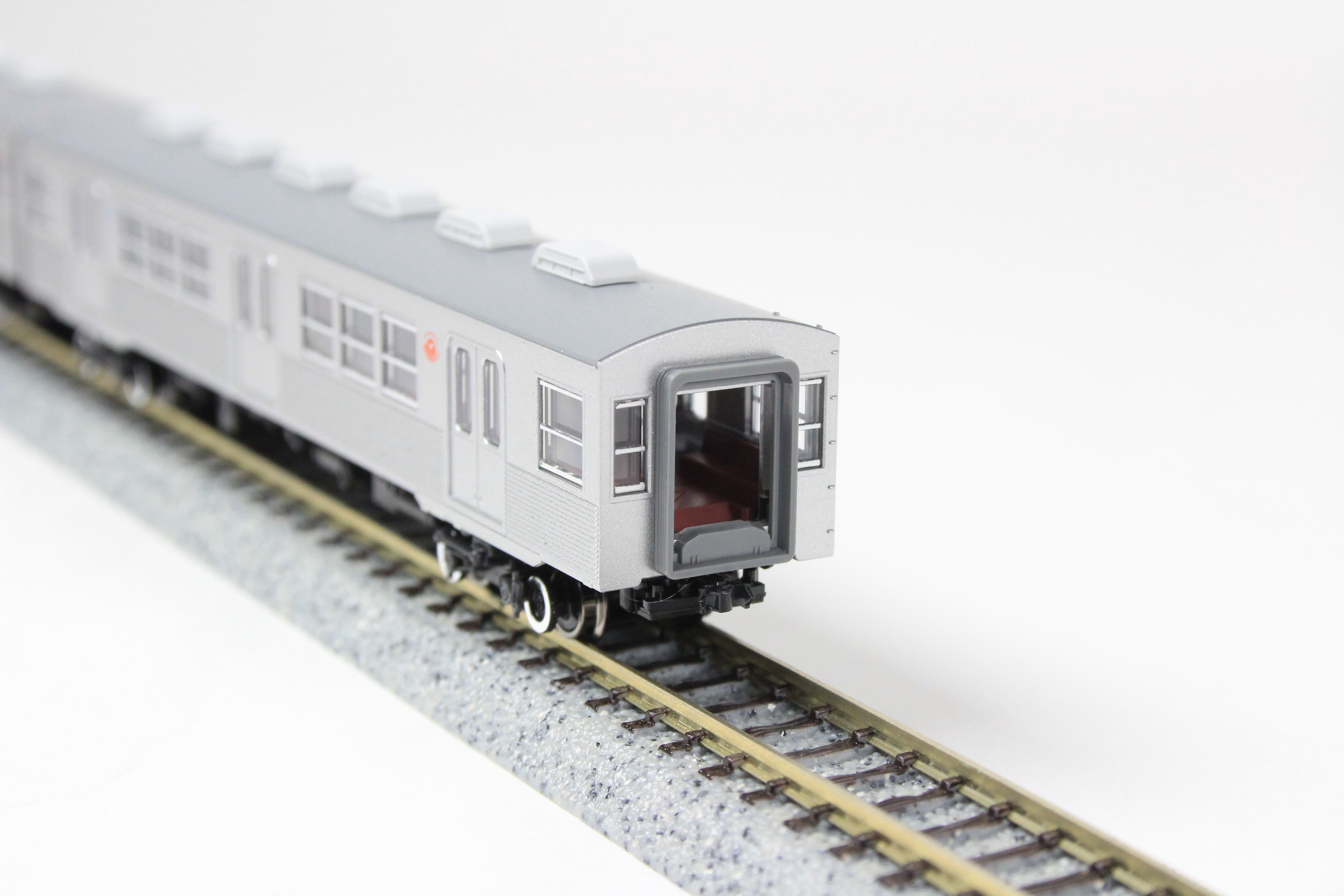 ・コルゲートが目立つステンレスボディの質感、単一カーブの屋根など、黎明期のステンレスカーで見られた無機質な外観を的確に再現。