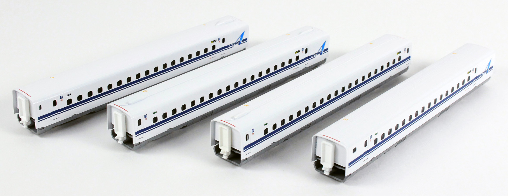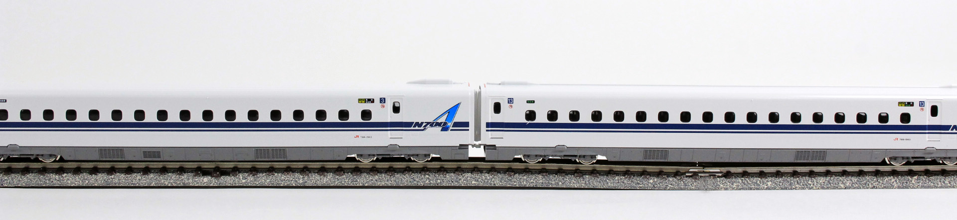 ? N700系との違いが明瞭にわかる、奇数号車車体側面に記された「A」をイメージしたロゴマークを鮮やかに再現。