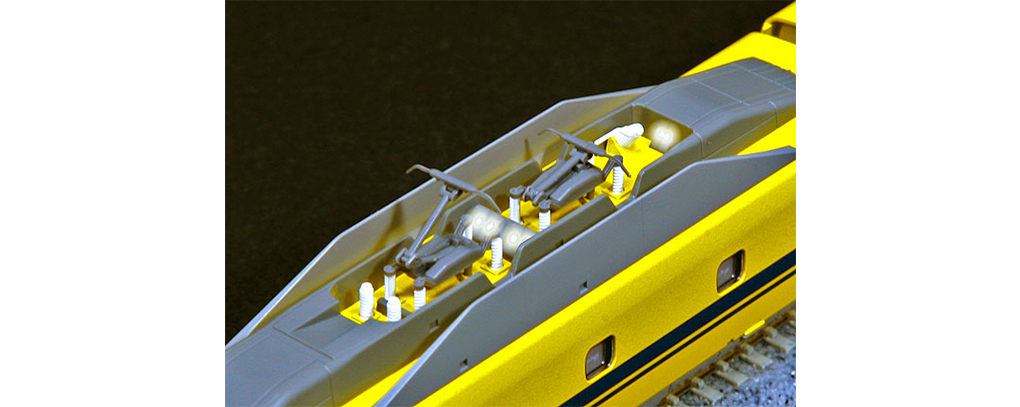 ● 車体の随所に配された、試験車ならではの屋根上の観測ドームや検測機器を的確に再現