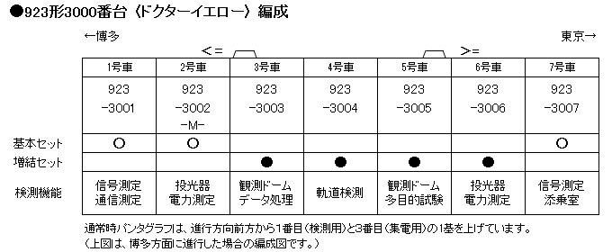 ● 700系新幹線をベースに登場したのが923形3000番台(T5編成)は、平成17年(2005)に製造されました。月に数度、東京-博多間を往復し、電気設備や軌道設備などを検測し安全輸送を支えているます。