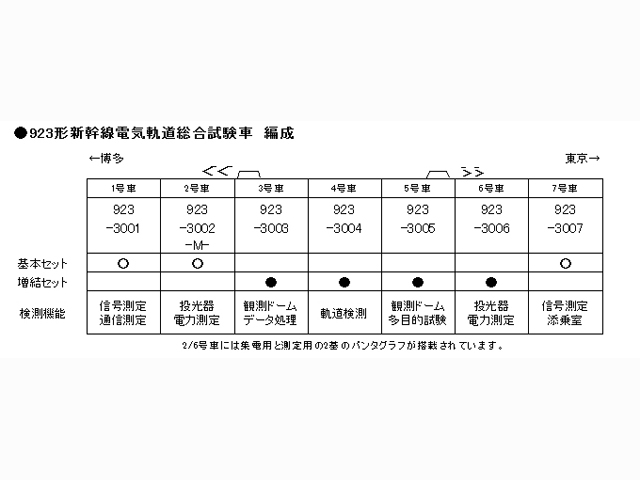 ● 700系新幹線をベースに登場したのが923形3000番台(T5編成)は、平成17年(2005)に製造されました。月に数度、東京-博多間を往復し、電気設備や軌道設備などを検測し安全輸送を支えているます。