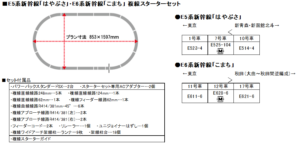 E5系「はやぶさ」とE6系「こまち」の2列車を同時に複線線路で楽しめるワンランク上の入門用セット、複線スターターセットを仕様変更してリリースいたします。