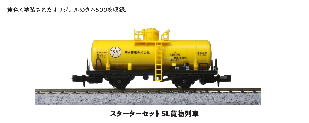 貨車にはトラ55000(積荷カバー付)、ワラ1、黄色く塗装されたオリジナルのタム500、ワフ29500を選定いたしました。小ぶりな車両の編成で懐かしい貨物列車の走行をお楽しみいただけます。