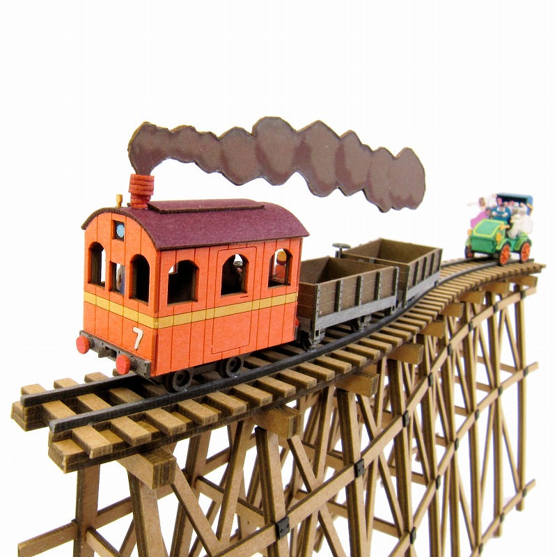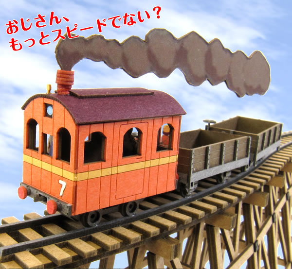 オレンジ色で黄色のライン、No.7が入った機関車はモクモクと煙を吐き出し走り、トロッコ2台を引っ張ります。