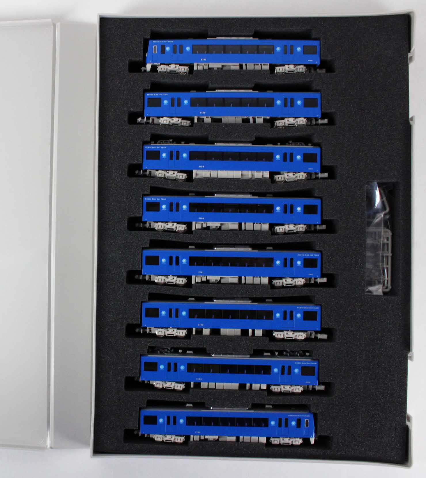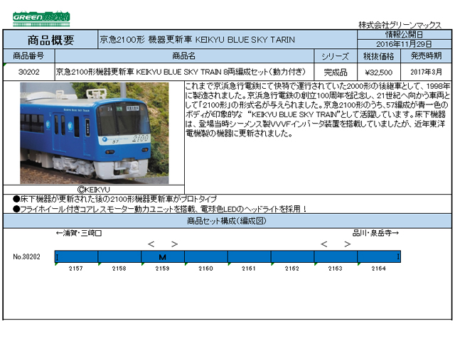 これまで京浜急行電鉄にて快特で運行されていた2000形の後継車として、1998年に製造されました。京浜急行電鉄の創立100周年を記念し、21世紀へ向かう車両として「2100形」の形式名が与えられました。京急2100形のうち、57編成が青一色のボディが印象的な “KEIKYU BLUE SKY TRAIN”として活躍しています。床下機器は、登場当時シーメンス製VVVFインバータ装置を搭載していましたが、近年東洋電機製の機器に更新されました。
