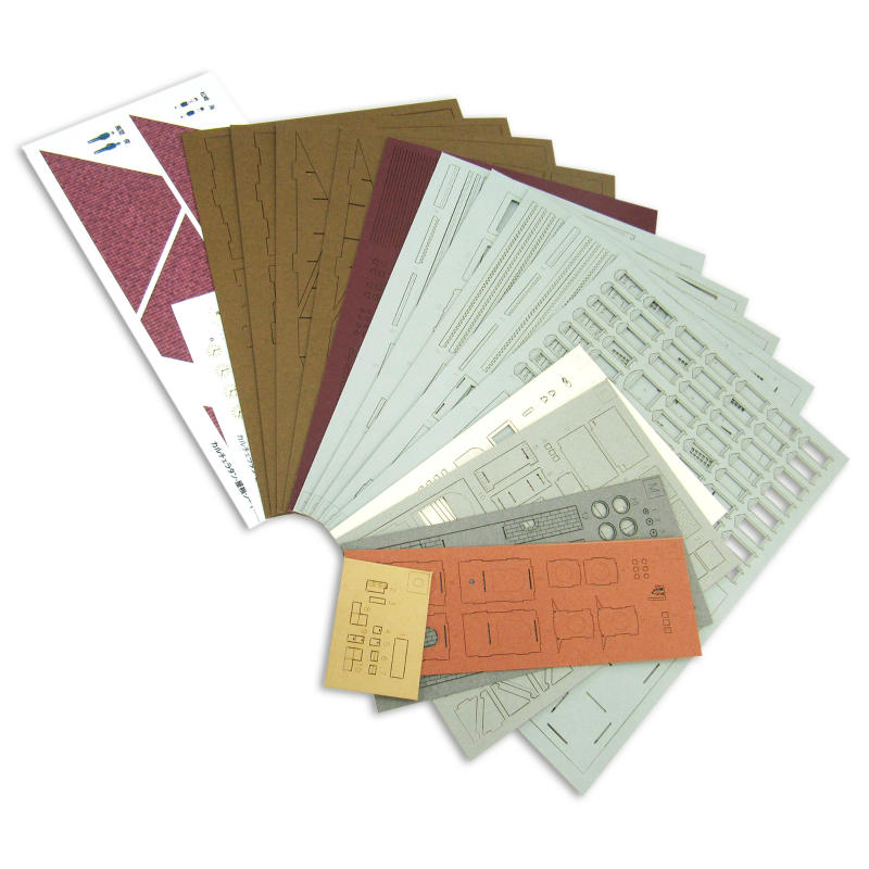 レーザーシートA〜O(15枚)、屋根シート(1枚)、印刷シート(1枚)、プラ板(2枚)、組立て説明書が入っています。