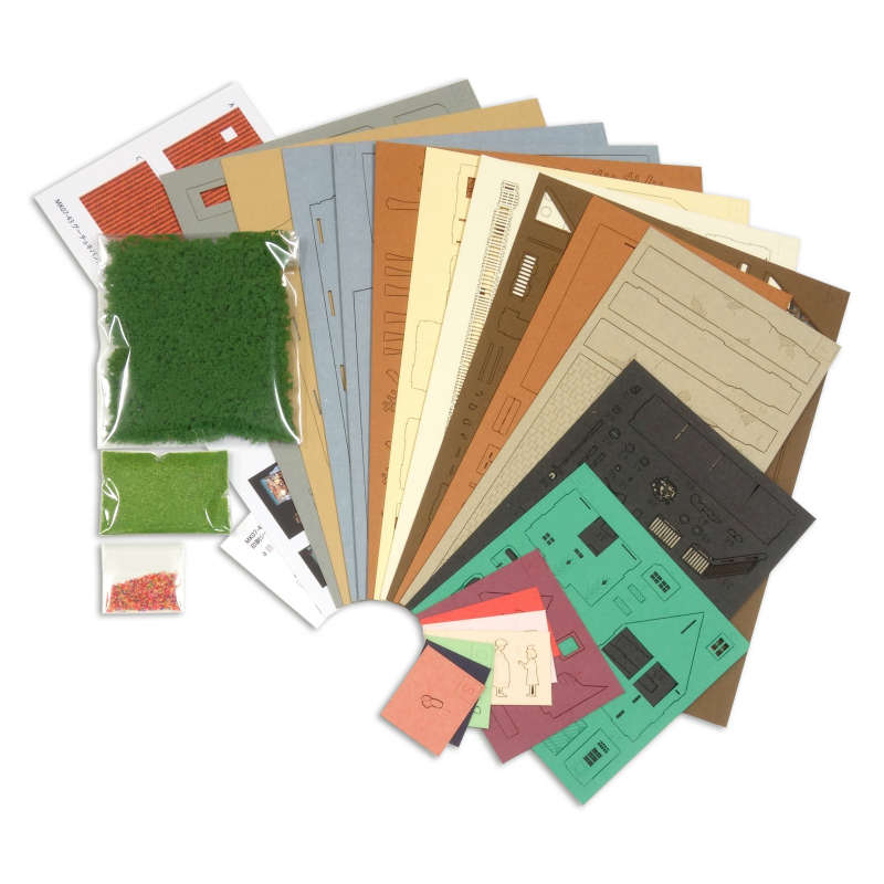 ■セット内容:レーザーシートA〜S(19枚)、印刷シート(2枚)、プラ板(1枚)、樹木、庭セット(スポンジ、パウダー、色砂)、組立て説明書