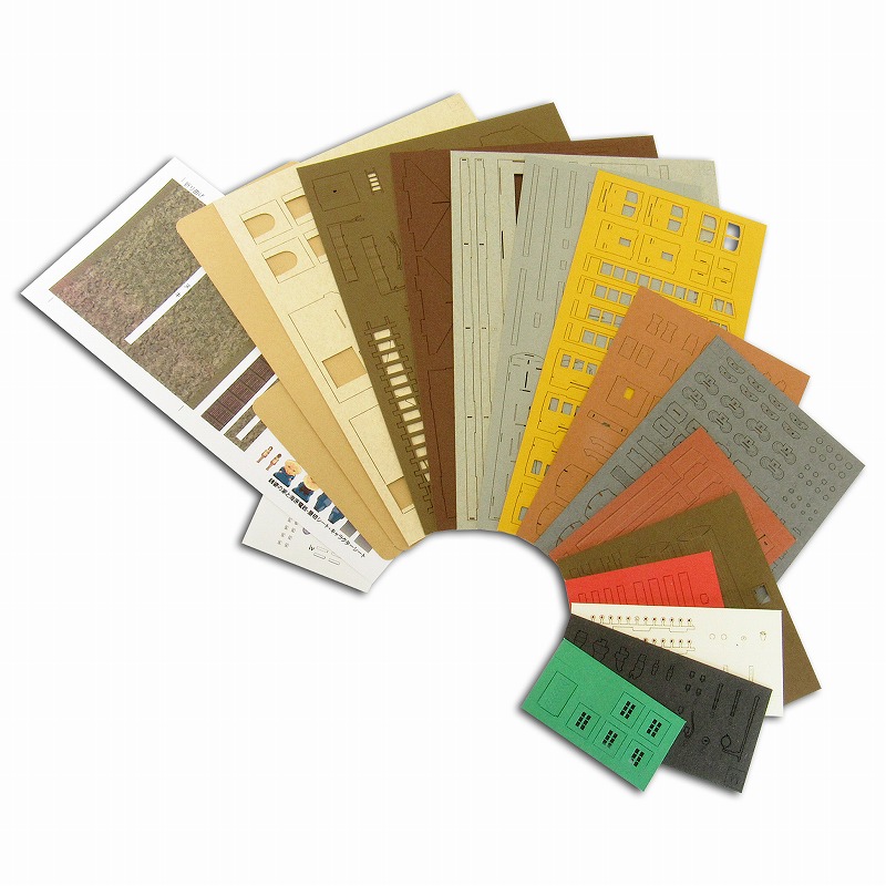 レーザーシートA〜N(14枚)と屋根・キャラクターシート、プラ板、透明フィルム、印刷(カンテラ・時計等)シート(各1枚)、ベース(2枚)が入っています。