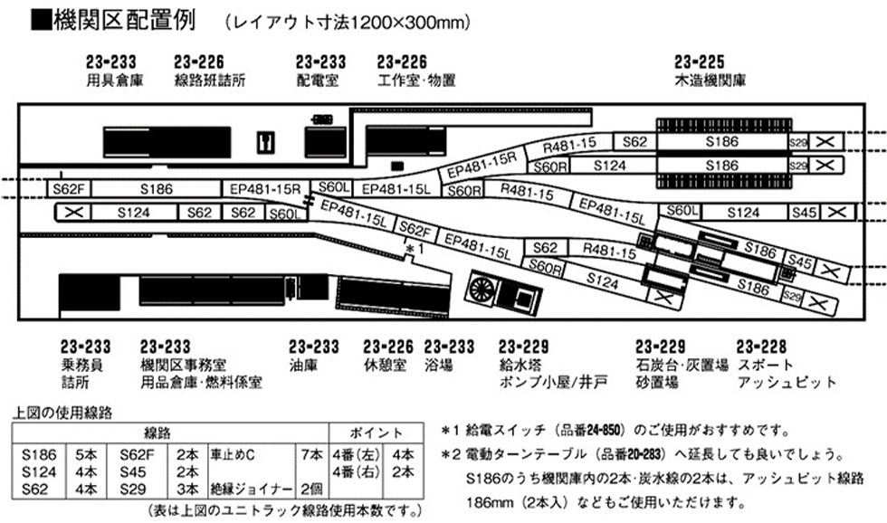 ・乗務員詰所、用具倉庫、用品倉庫、浴室、油庫、燃料係室、配電室、機関区事務室、モニュメント、百葉箱が1つずつ入ったセット