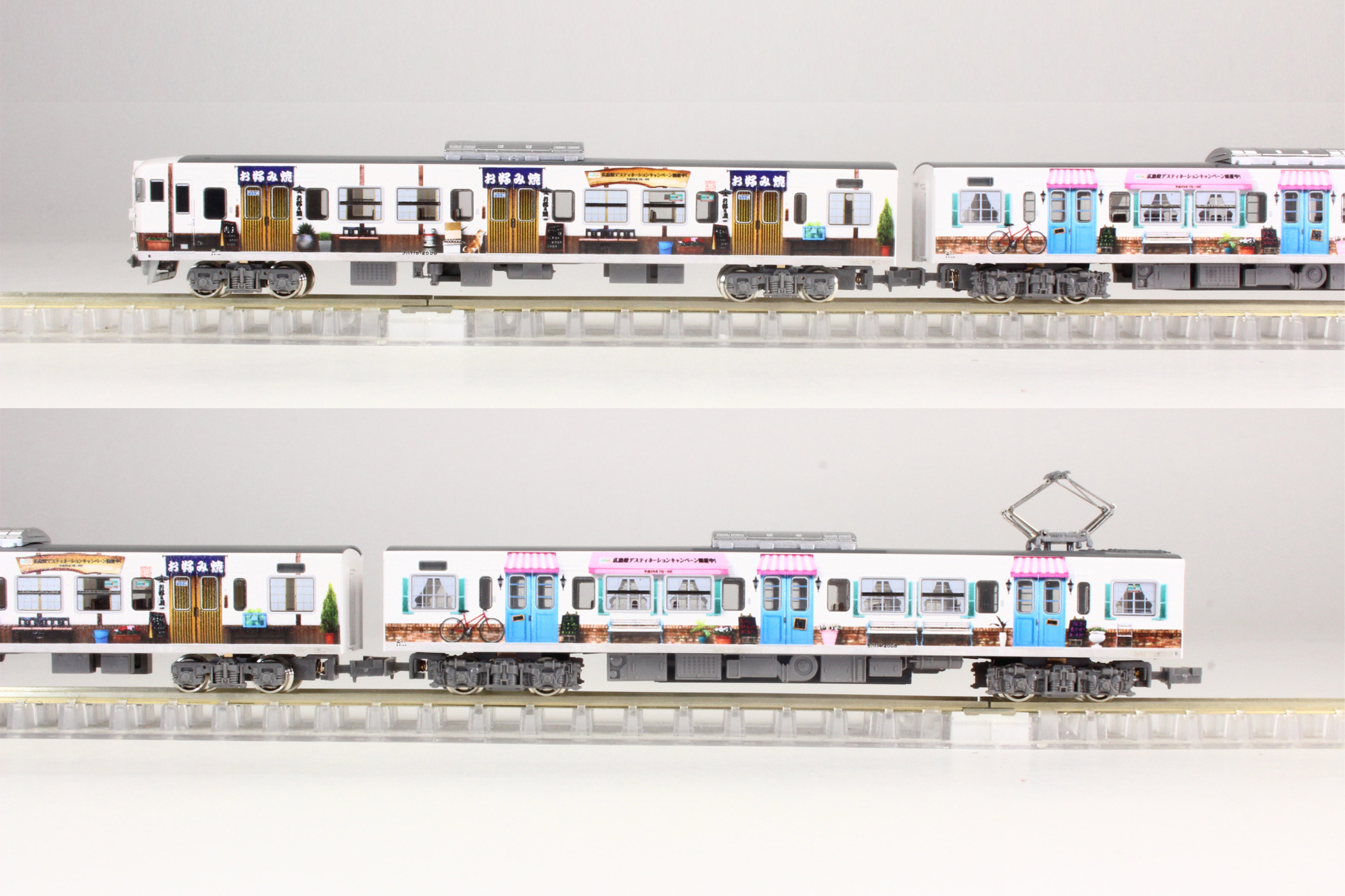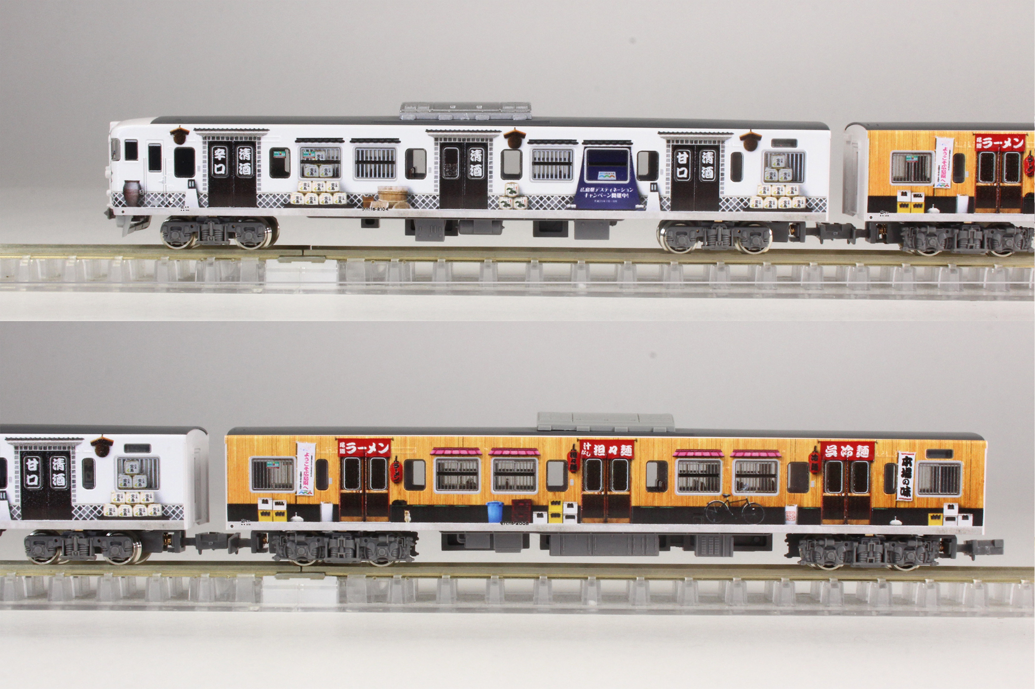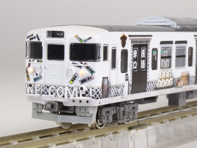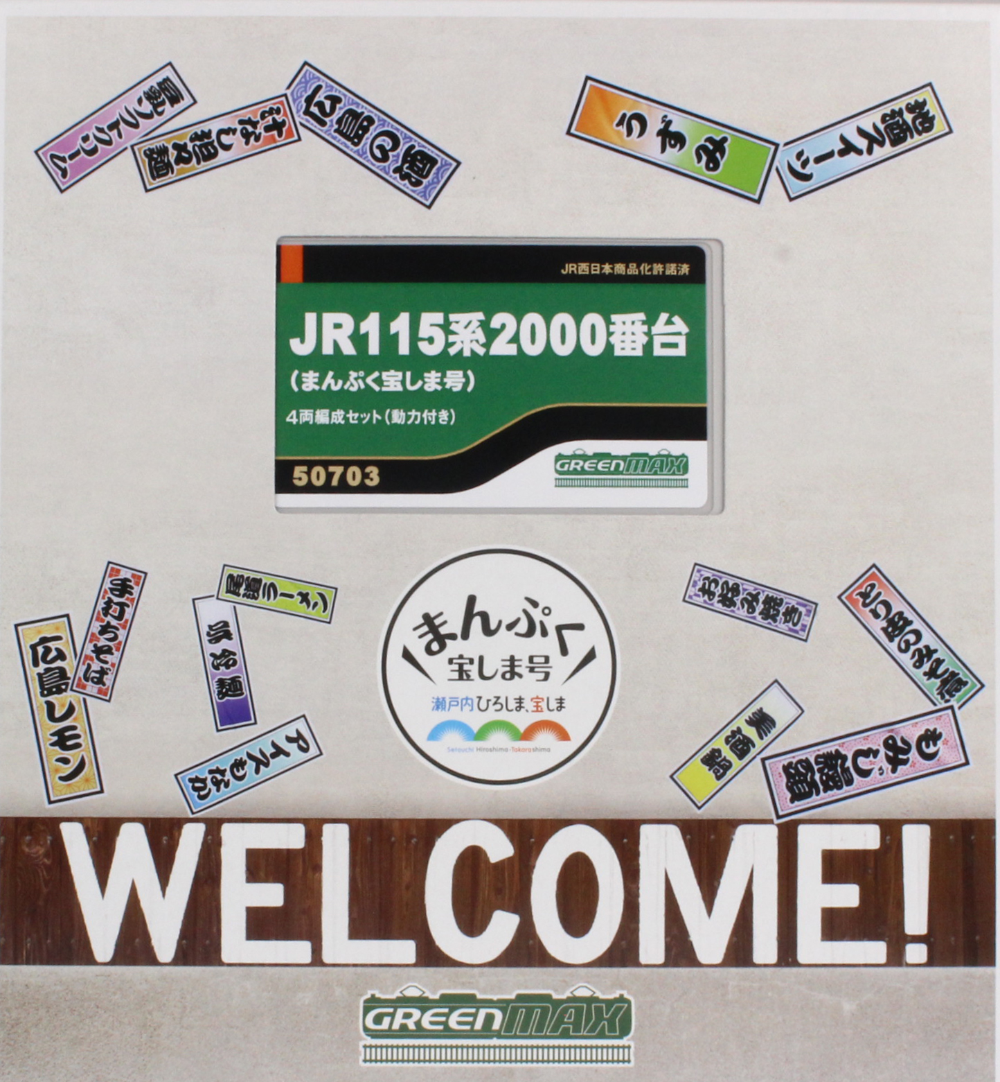 「まんぷく宝しま号」は2013(平成25)年7月から9月まで開催された広島県デスティネーションキャンペーンの一環として、広島の食をテーマにお好み焼き、スイーツ、ラーメン、酒蔵が115系L-12編成にラッピングされた車両です。山陽本線三石〜下関間、呉線、可部線で運転されました。