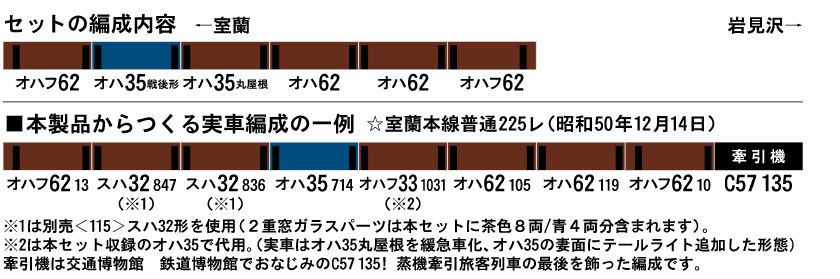 編成例の室蘭本線225レは国鉄最後の蒸気機関車牽引による定期旅客列車として、1975(昭和50年)12月14日に「SLさよなら列車」として運転された列車です。