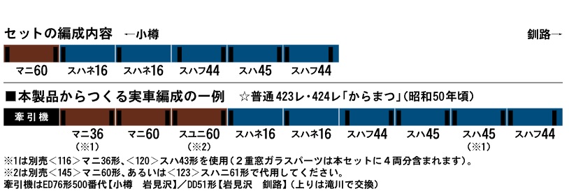 本セットに付属しますスハ45形・スハフ44形は、北海道向けにスハ43形・スハフ42形をベースに耐寒構造強化が施され、客室窓の二重窓化や蓄電池箱の大形化、車軸発電機が歯車駆動式となっている点が特徴です。