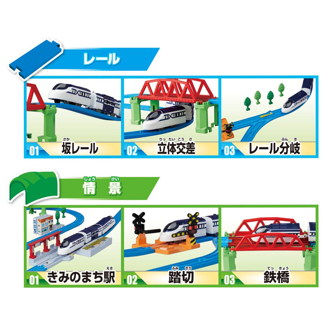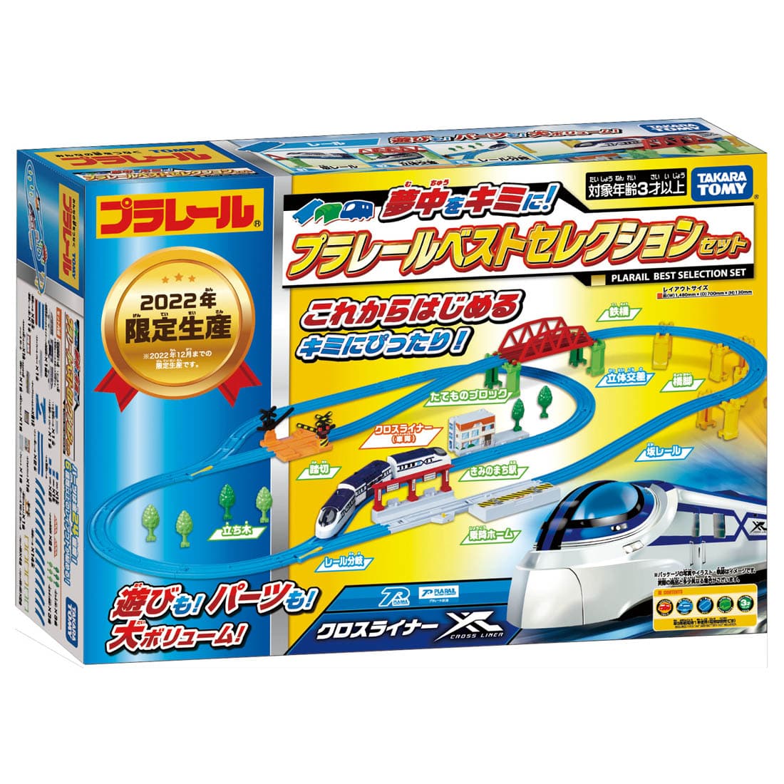 | 商品内容 | 車両本体(クロスライナー/3両編成)(1)、直線レール(赤×1含む)(3)、1/2直線レール(グレー×1含む)(2)、1/4直線レール(凸凹×2、凸凸×1、凹凹×1)(4)、ストップレール(グレー)(1)、ニュー坂レール(2)、曲線レール(14)、ターンアウトレール(L・R各1)(2)、ブロック橋脚(4)、ブロック橋脚(黄緑)(2)、小さな鉄橋枠(2)、踏切(1)、(踏切ベース×1、警報機×2、遮断かん×2)、きみのまち駅(ホーム×1、屋根×1)(1)、きみのまち駅(乗降ホーム)(1)、立ち木(緑)(3)、立ち木(黄緑)(3)、お客さんブロック(1)、たてものブロック(1)、プレート(1)、シール(1)、取扱説明書(1)、部品注文書 |