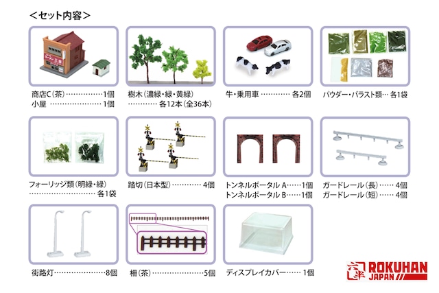 商店C(茶)×1個、小屋×1個、ディスプレイカバー×1個、パウダー類×各1袋、乗用車×2個、牛×2個、樹木(濃緑)×8本、樹木(緑)×12本、樹木(黄緑)×6本、フォーリッジ類(濃緑、緑)×各1袋、バラスト(灰色)×1袋、トンネルポータル(A、B)×各1個、ガードレール(長)×4個、ガードレール(短)×4個、街路灯×8個、柵(茶)×2個、踏切(日本型)×4個