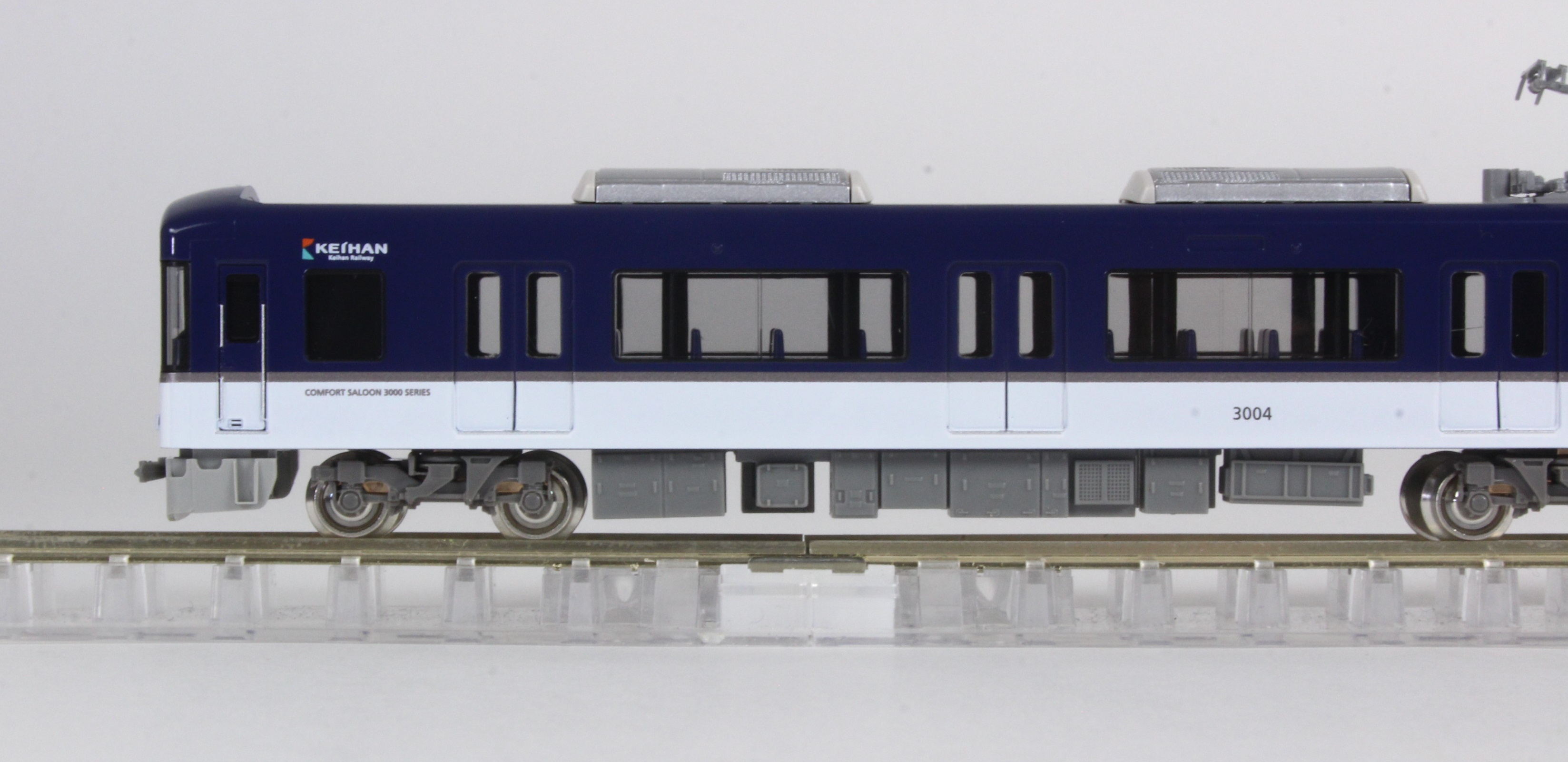 京阪3000系は、2008年10月の中之島線開業に合わせて新造された京阪の次世代を担う車両で、内外とも斬新なデザインで造られています。2017年8月からは前面デザインが一部変更され、前面貫通扉に液晶ディスプレイが、また前面窓下には装飾灯が設置され、特急運用時には「鳩マーク」が表示されます。