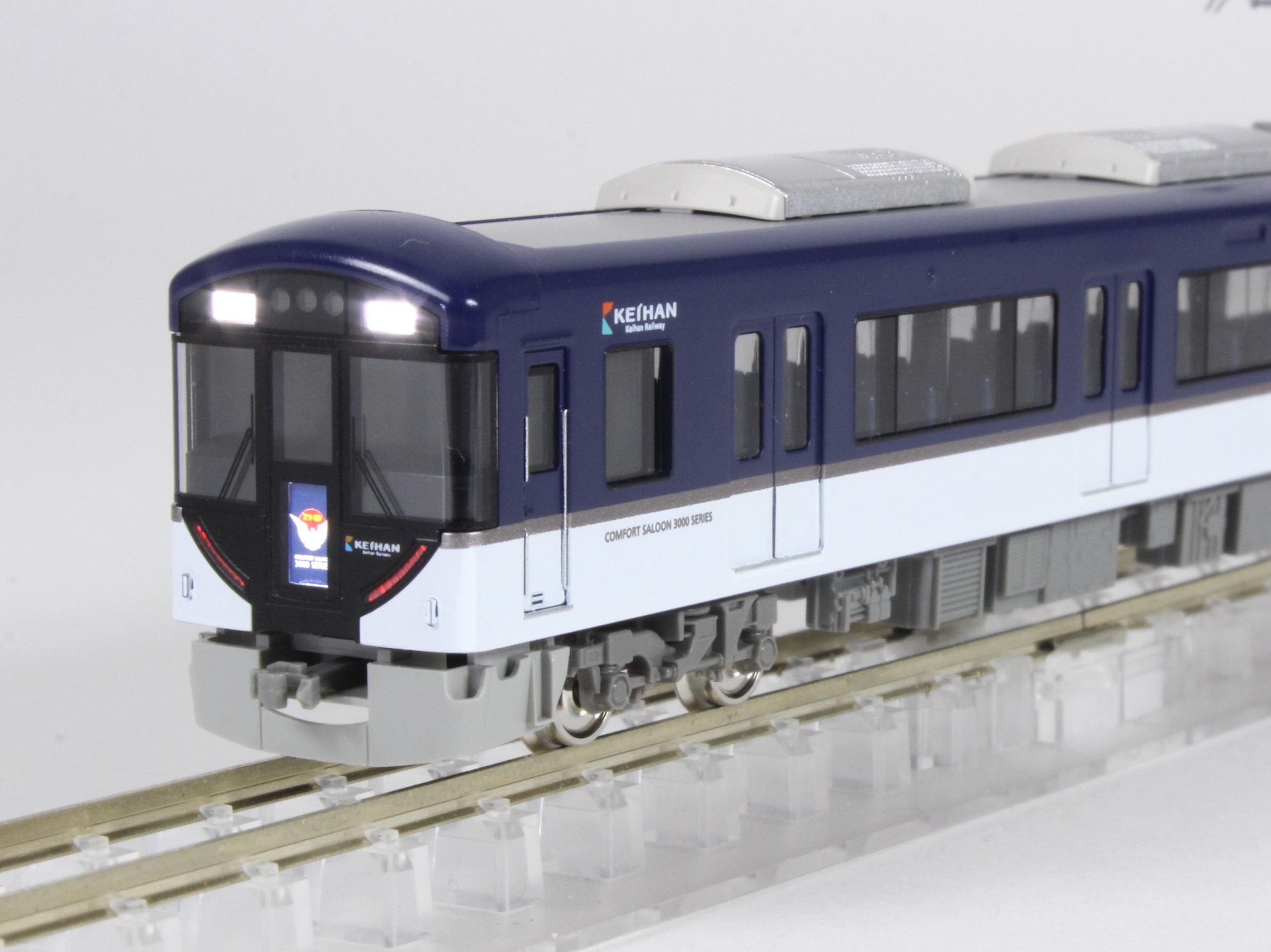 京阪3000系は、2008年10月の中之島線開業に合わせて新造された京阪の次世代を担う車両で、内外とも斬新なデザインで造られています。2017年8月からは前面デザインが一部変更され、前面貫通扉に液晶ディスプレイが、また前面窓下には装飾灯が設置され、特急運用時には「鳩マーク」が表示されます。