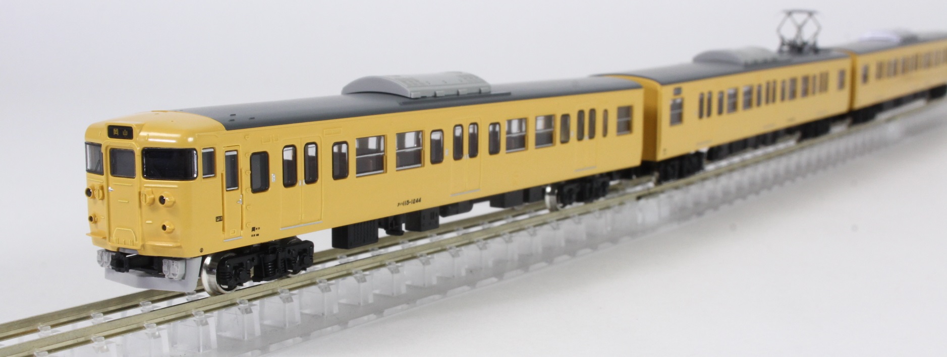 JR115系は、国鉄時代の1963年から1983年までにおよそ1900両が製造された勾配路線用の近郊形車両です。1000番台は特に耐寒・耐雪強化構造を備え、クロスシートの間隔を拡大した「シートピッチ改善車」で、そのため側面の窓割が従来車と異なる他、電動車(クモハ・モハ)の車端部に雪切室冷却風取入ルーバーが設置されている等の特徴があります。国鉄の分割民営化に伴いJR西日本に継承されたグループは、その後車体更新工事が行なわれ、「30N体質改善車」、「40N体質改善車」として現在も活躍しています。岡山地区の115系は4両編成がA編成、3両編成がD編成と呼ばれています。