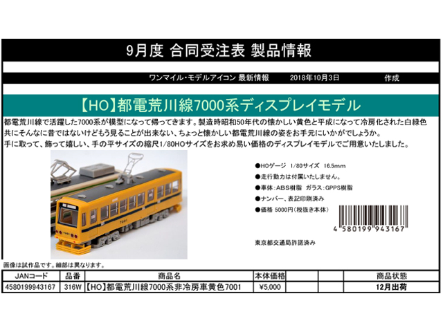 ※ディスプレイモデルです。走行させる為には別途「品番319Z【HO】都電荒川線7000系用動力ユニット」が必要です。