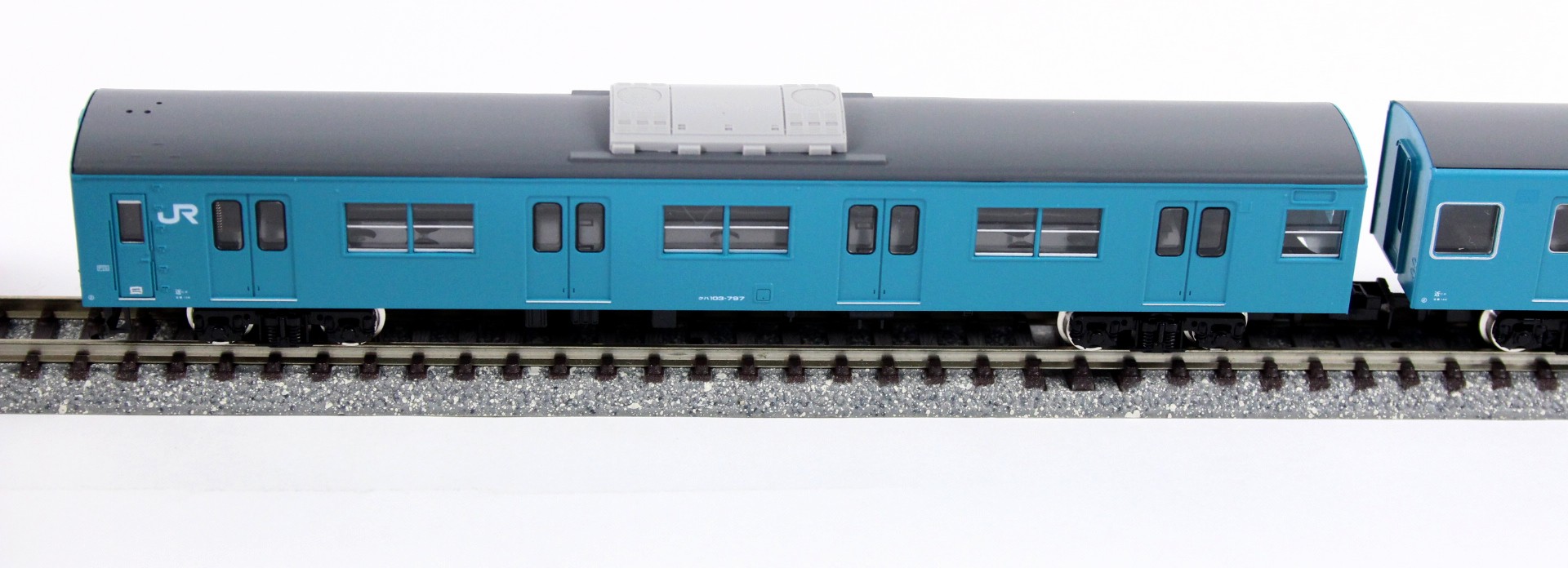 ■モハの側面ルーバー、車外スピーカー、前面「ワンマン」表示は印刷済み。