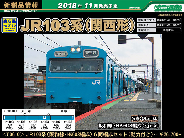 103系は、国鉄初の新性能通勤車101系を手本とし、より経済性を重視して設計の基で製造された汎用通勤型電車で、1963年から3400両あまりが造られました。東京首都圏や大阪近畿圏を中心に通勤輸送の花形として、半世紀に亘って活躍してきました。国鉄の分割に伴ってJR北海道とJR四国を除くJR各社に引き継がれ、JR西日本管内では大阪環状線、阪和線、関西線などのほか、岡山・広島地区でも日常の足として親しまれてきましたが、現在では一部の路線にわずかに残るのみとなりとなっています。