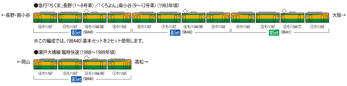 【TOMIX 品番:98440 165・167系 冷改車・湘南色・宮原電車区 基本4両セット のばらし販売商品です。(収納個所:2+3両目 トイレタンク角形*1)】
