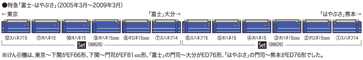 2005年からは14系のみの編成となり「富士・はやぶさ」が運行され2009年で運行終了となりました。