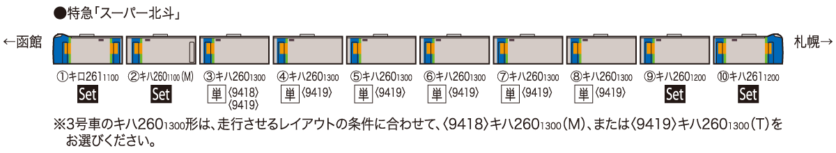 ※セット4両+キハ260-1300単品6両でスーパー北斗10両編成を再現可能
