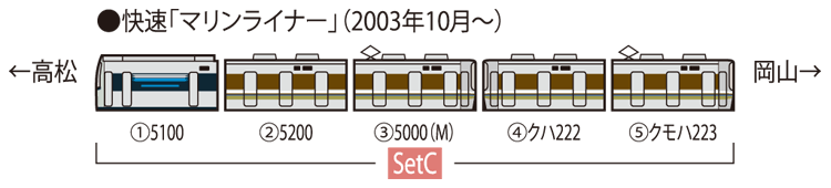 2003年10月より活躍を開始した瀬戸大橋線のマリンライナーはJR西日本所有の223-5000系とJR四国所有の5000系で運転されています。