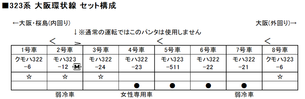 ●取付済の前面表示および車体の側面表示は「O普通 大阪環状線」を印刷済。交換用前面表示は「P普通 ユニバーサルシティ・桜島」