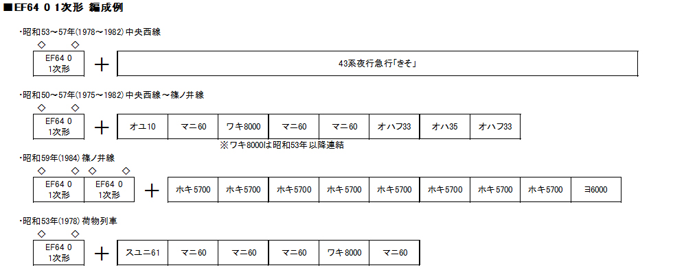 EF64 0番台はEF62/EF63をベースとした勾配線区用の標準機関車として登場しました。平坦線区用のEF65などと出力は同じですが、急勾配で安定したブレーキ力を得られる発電ブレーキを備えており、そのために大形化された側面フィルターが特徴です。1次形は客貨両用として電気暖房を装備しています。試作および1次形は福島〜山形間(当時は直流電化)に投入され、以後の量産機は主に中央本線・篠ノ井線へと投入され活躍しました。