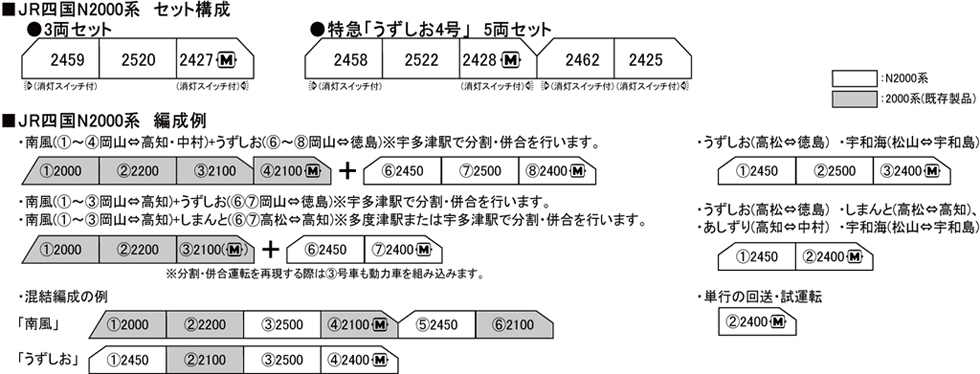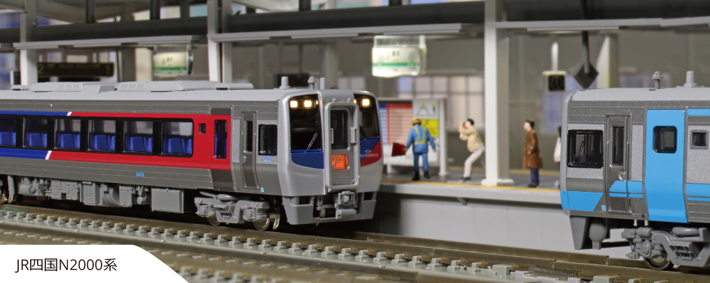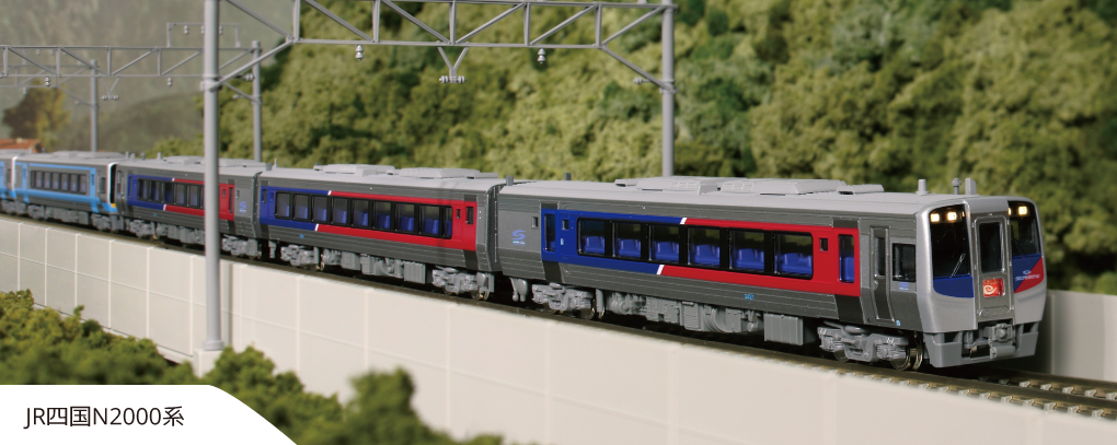 2000系に引き続き、出力増強形であるN2000系が登場です。従来車との違い・進化の過程を模型でお楽しみいただけます。「うずしお」に見られるN2000系のみの整った編成はもちろん、「南風」+「うずしお」の併結のほか、N2000系と2000系を混結した気動車ならではの多様な編成が再現可能です。特急「うずしお4号」5両セットは量産先行車(2458)を含んだ構成です。
