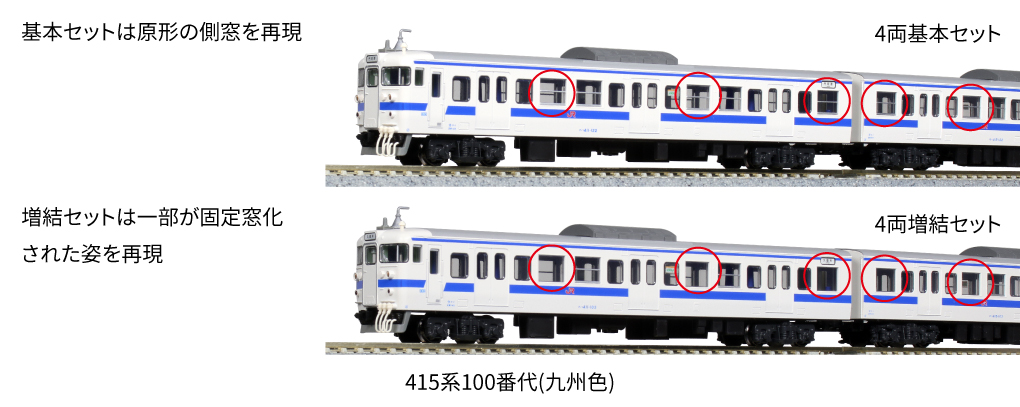 ●4両基本セットは原形の側窓、4両増結セットは一部側窓が固定窓化された形態の特徴を再現