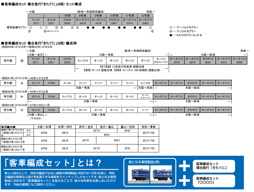 客車編成セット 寝台急行「きたぐに」は、旧形客車と12系客車で組成された「きたぐに」を再現可能なセットです。10-1550 12系急行客車 国鉄仕様 6両セットを合わせれば、フル編成となります