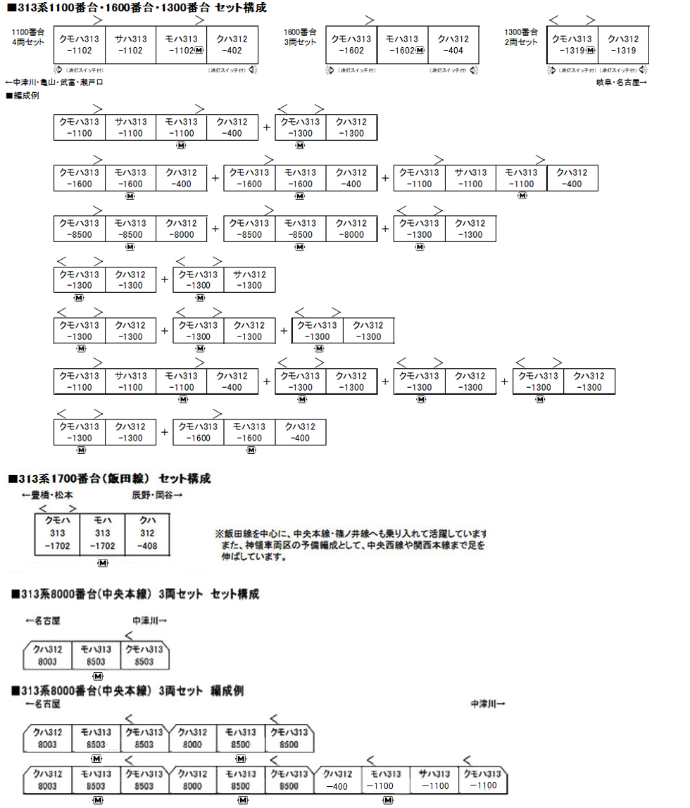 ・各セットともに前面行先表示は「快速名古屋」取付済、交換用として1100番台、1600番台は「普通多治見」、1300番台は「ワンマン普通亀山」が付属