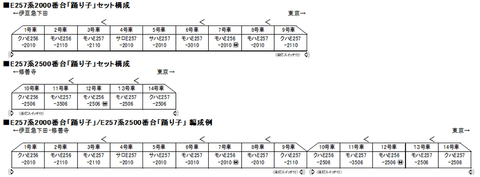 2000番台は従来「あずさ」「かいじ」として活躍していた0番台、2500番台は「わかしお」「さざなみ」などで活躍していた500番台をベースに改造が行われ、制御機器の更新のほか、灯火類のLED化、E261系に合わせた白に紺碧色のデザインへの変更でイメージが一新されました。2000番台は東京と伊豆、2500番台は東京と修善寺を結んでおり、東京〜伊東間は2000番台と2500番台の併結運転が行われています。