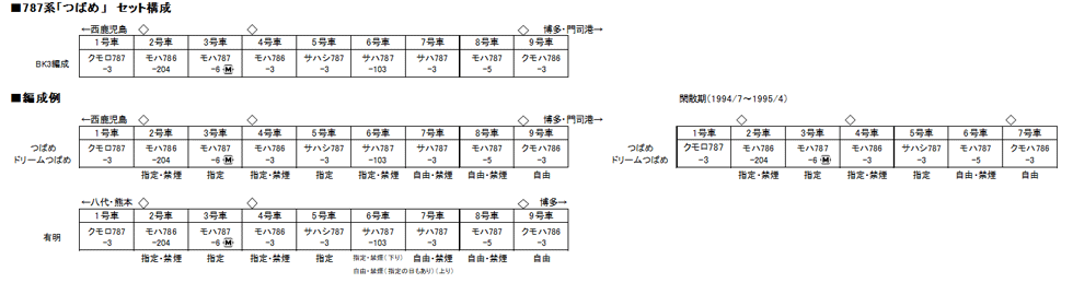 ●編成は鹿児島運転所所属のBK3編成、平成6年(1994)頃の前面手スリ増設後、サハシ787が3号車から5号車に位置変更された姿がプロトタイプ