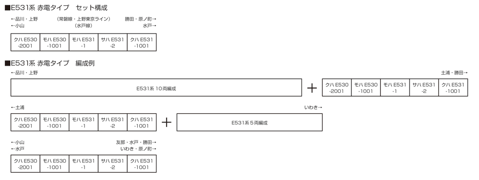 ●実車同様の5両編成(11号車:クハE530-2001、12号車:モハE530-1001、13号車:モハE531-1、14号車:サハE531-2、15号車:クハE531-1001)