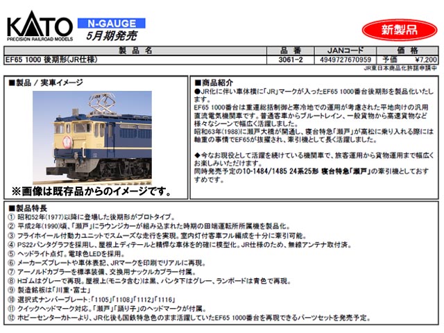 KATOは、東海道・山陽本線を走破し、昭和50年代、空前の「ブルトレブーム」を巻き起こしたブルートレイン牽引機、東京機関区の高速客貨両用のEF65 1000 後期形(JR仕様)を製品化いたしました。