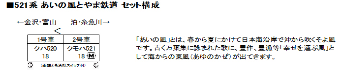北陸新幹線の開通による北陸本線の第三セクター化に伴って、倶利伽羅(くりがら)〜市振(いちぶり)間があいの風とやま鉄道として運行されています。JR西日本より521系2次車が16編成譲渡され、現在活躍しています。