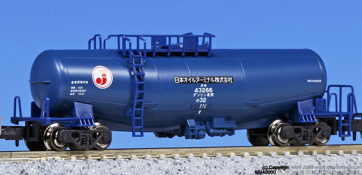 ?タキ43000(青):日本オイルターミナル時代の青い塗色のまま、表記類が日本石油輸送仕様に変更された姿を再現。