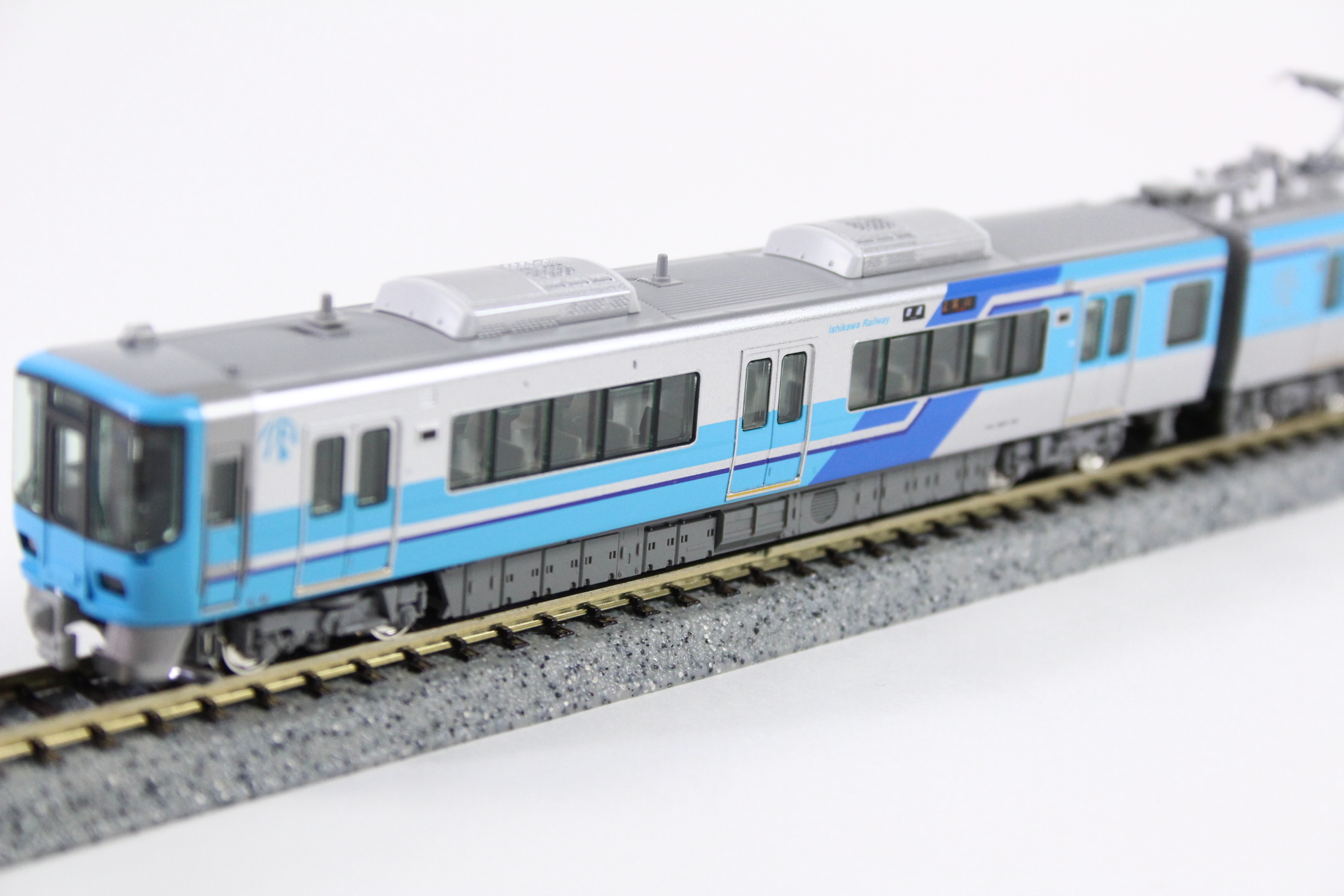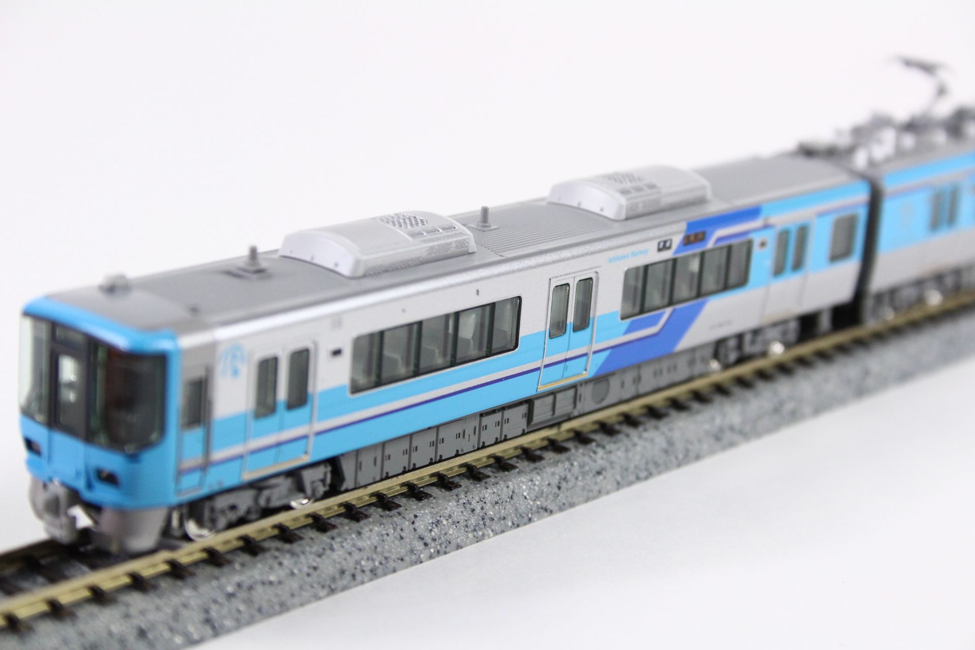 ?IRいしかわ鉄道独自の、前頭部と側面の水色をベースに青色が配された大胆な塗色を的確に再現。