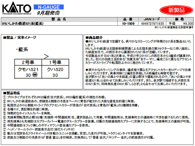 ●IRいしかわ鉄道で活躍する、爽やかなカラーリングが特徴の521系を製品化いたします。