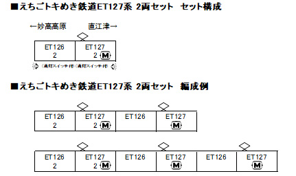 えちごトキめき鉄道は、平成27年(2015)3月の北陸新幹線長野〜金沢間開業によるJRの並行在来線の経営分離に伴い誕生した第3セクターです。ET127系は旧信越本線の区間である妙高はねうまライン(妙高高原〜直江津)で活躍している車両で、車体に施された妙高山の山並みをイメージしたデザインと、フレッシュグリーンのシンプルで爽やかな塗色が特徴です。スノープロウ一体式の厳つい強化形スカートを装備しています。