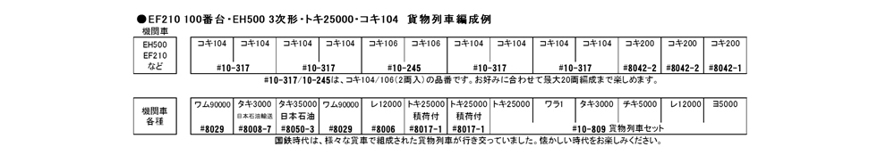 ●JR貨物を代表する直流電気機関車EF210は、平成8年(1996)に登場しました。100番台は制御ユニットや側面に大きなエアフィルターの増設を行い、また109番以降はパンタグラフをシングルアーム化しています。JRの機関車で初めて愛称が採用され“ECO-POWER桃太郎”のロゴが車体に描かれています。