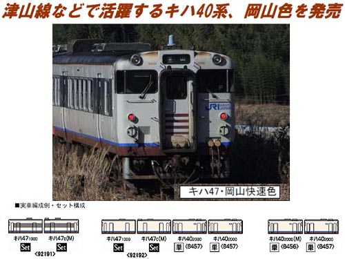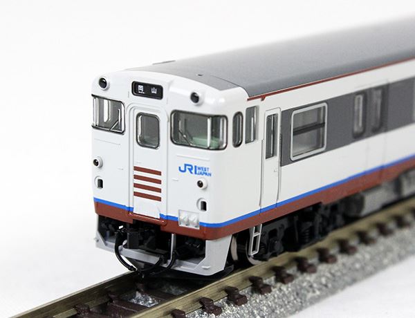・岡山地域で活躍する車両は灰色と茶色に青帯を巻いた姿で津山線・吉備線などで活躍しています。
