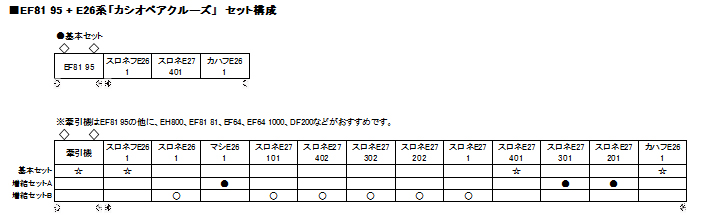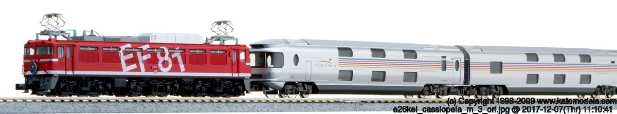 ◆同時に再生産を行う既存製品のE26系「カシオペア」の増結セットと合わせることで「カシオペアクルーズ」をフル編成で再現できます。「3086 EH800」「3066-6 EF81 81」などの機関車と共に、牽引機を付け替えてお楽しみいただけます。