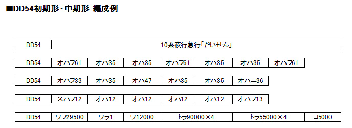 日本離れしたスタイルが印象に強いDD54は、大出力1エンジンの亜幹線用として試作機DD91をベースに昭和41年(1966)から製作された量産機です。福知山、米子の両機関区に所属し、山陰本線京都から浜田間、福知山線、播但線、伯備線の各線で普通客車列車から貨物列車まで広範囲に活躍しました。優等列車では急行「だいせん」「出雲」「おき」の他、対応改造機による特急格上げ後の20系「出雲」の牽引も有名です。末期は福知山機関区に集結し、播但線の運用を最後に昭和53年(1978)6月に引退しました。