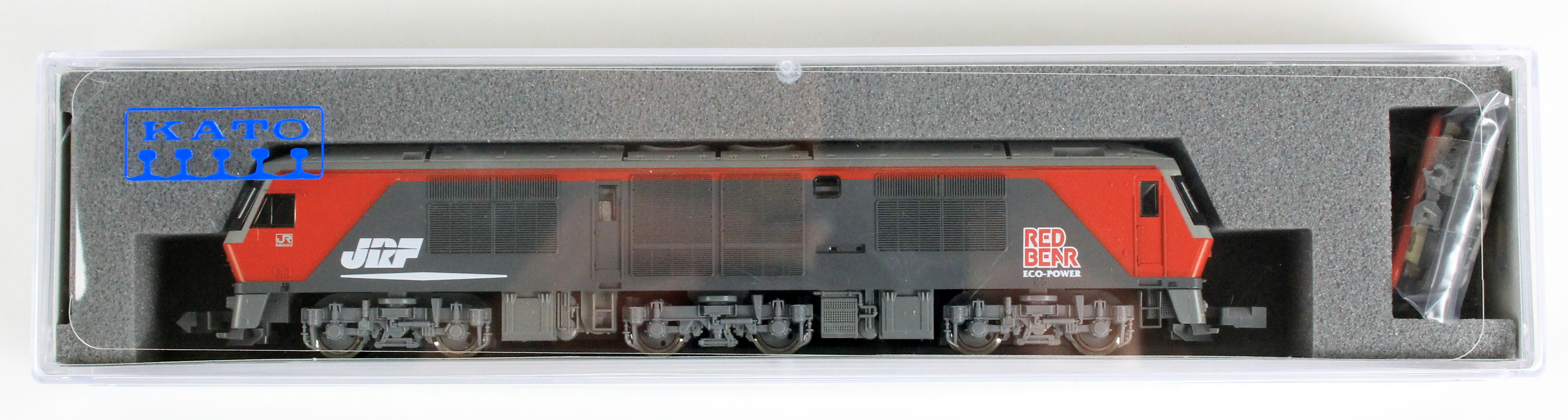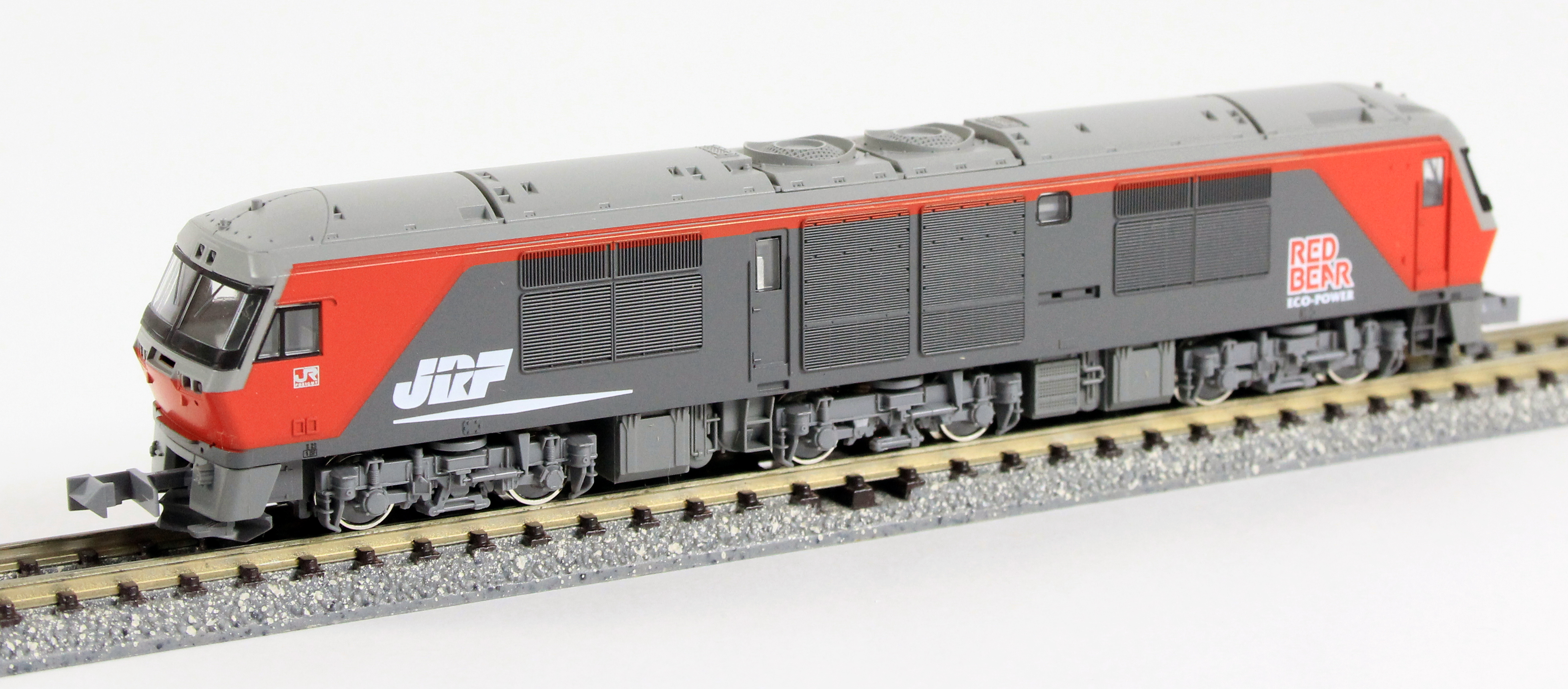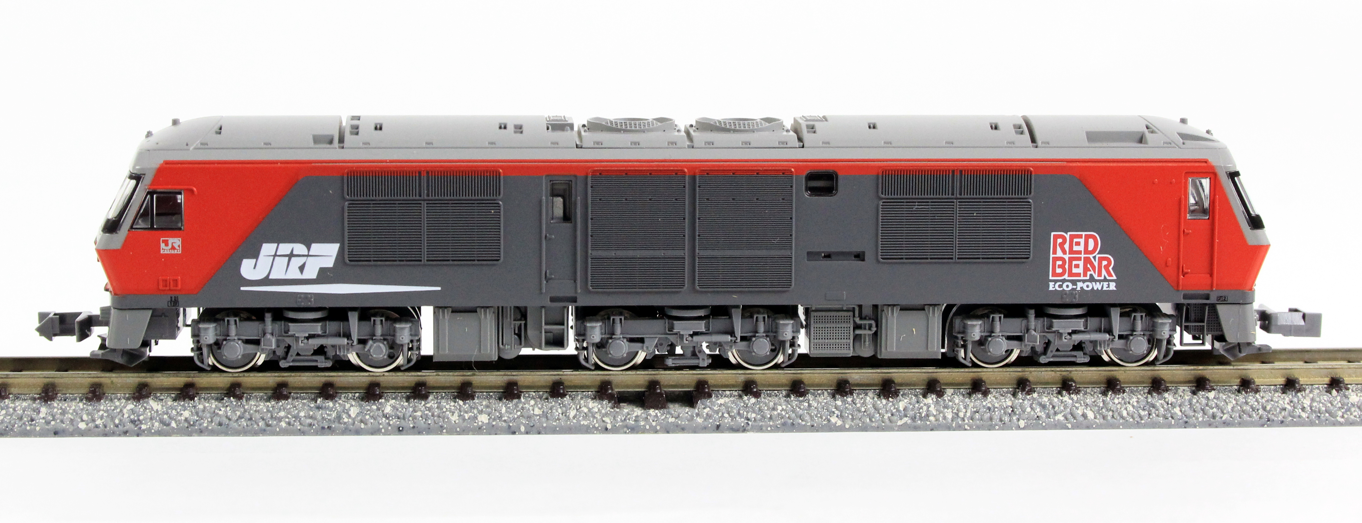 「ECO-POWER RED BEAR(エコパワー レッドベア)」という愛称ロゴが車体側面に描かれています。現在、北海道で高速貨物列車を牽引して活躍中のほか、愛知にも1機が所属し、今後の活躍にも期待ができる機関車です。